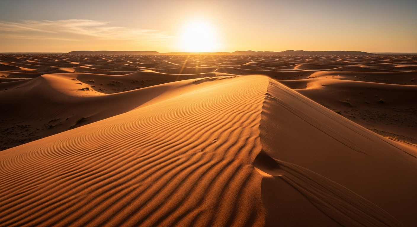 Imagine a vast, golden landscape stretching endlessly under a sky painted in hues of orange…